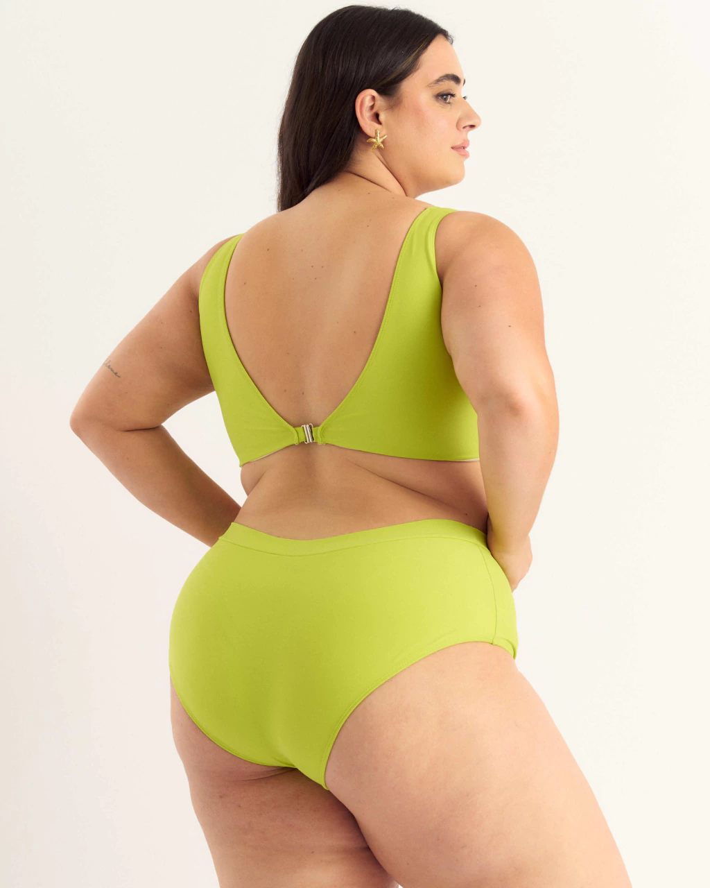 Bombacha tipo culotte tiro alto, con pierna baja y cola bastante cubritiva. Cintura angosta. Similar a nuestro modelo BEACH pero sin las tiritas laterales.