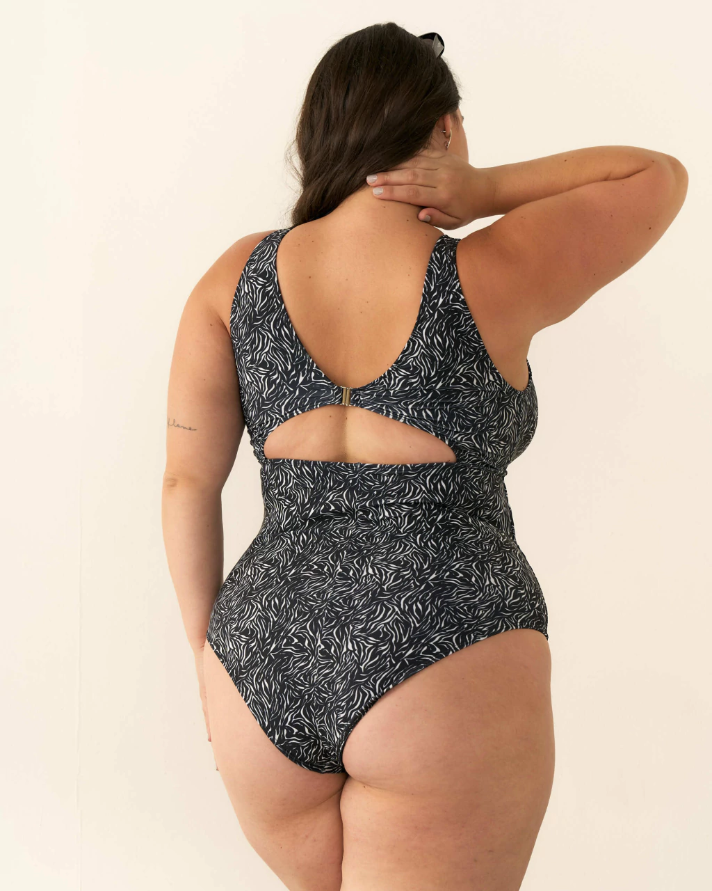 Enteriza con corte bajo busto y espalda estilo deportiva, con gancho para abrochar. Posee frunces en las tasas que le dan capacidad al corpiño. Breteles súper anchos, muy cómodos. Escote en V y detalle de lacito en el centro.