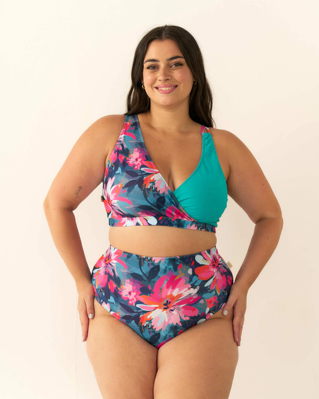 La delantera es amplia, con tasas con gran capacidad, pensadas especialmente para bustos grandes. Posee un cruce delantero que genera un efecto visual muy lindo, combinando estampado con color pleno.