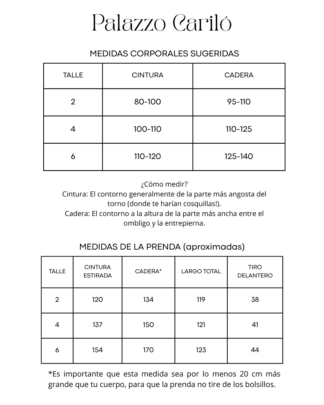 ATENCIÓN: Este pantalón es LARGO. Está pensado para que nuestras clientas de 1.80 lo puedan usar tranquilas con sandalias altas y cubra el zapato, ya que es la búsqueda estética de este pantalón: rozando el suelo. Nosotras te lo podemos mandar a acortar antes de enviártelo. El valor es de $20.000 (transfe) y suele demorar 1 día. Podés escribirnos por whatsapp o podés dejar escrito en las notas de tu pedido, aclarando cuánto querés que lo cortemos. Podés medir un pantalón similar, o tomar la medida desde la cintura hasta donde querés que llegue la prenda.
