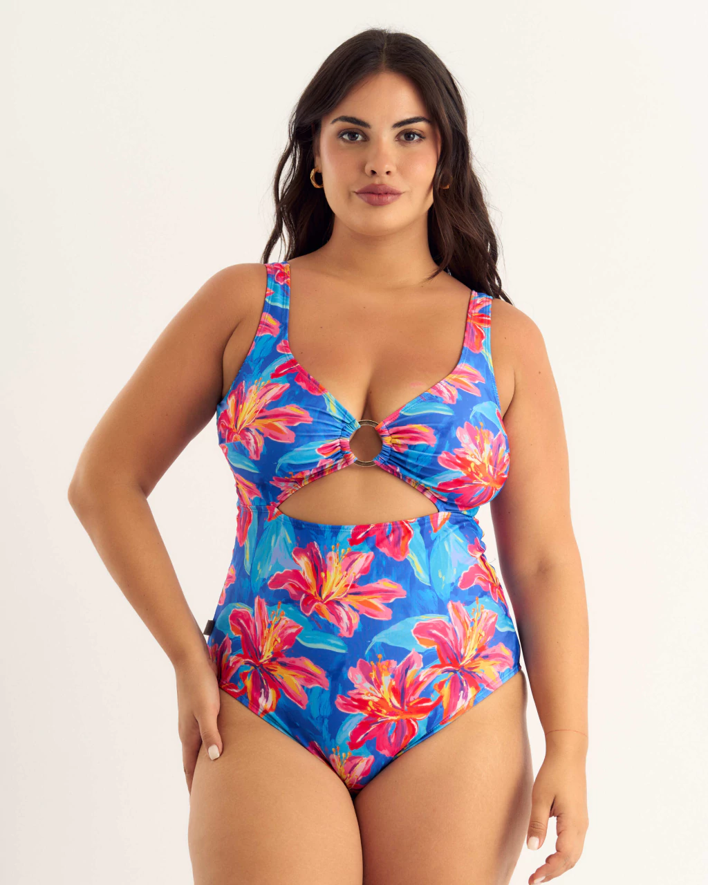 Enteriza con abertura bajo busto, con escote amplio de líneas rectas y detalle de argolla zamak central. El zamak es un material que no se oxida, no se recalienta con el sol y además es hipoalergénico.