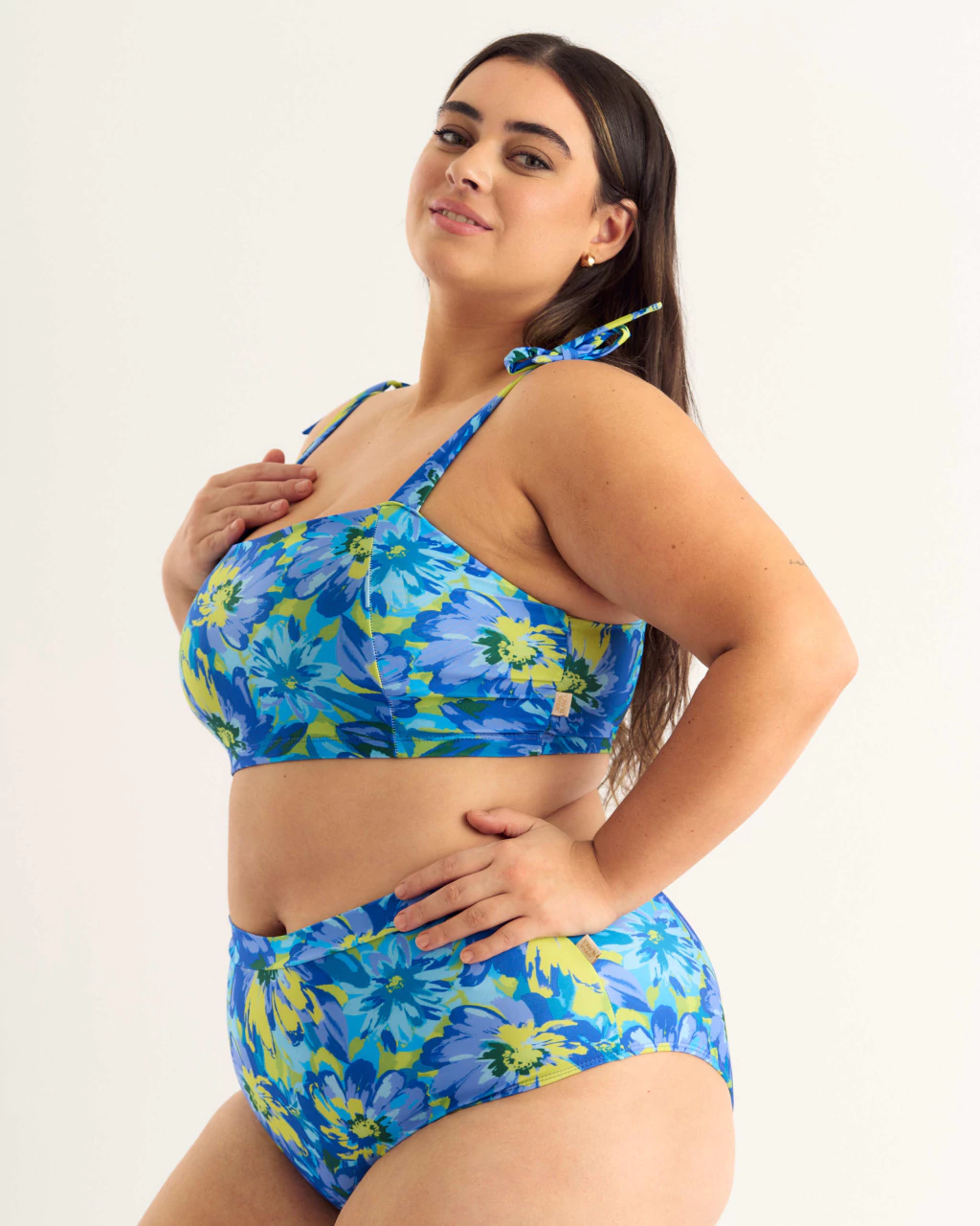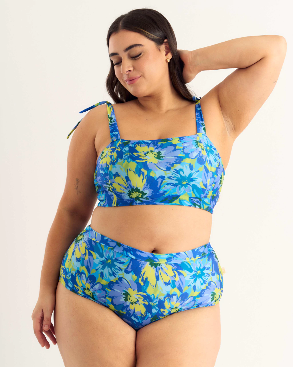 Top de escote recto y embolsado (sin costuras a la vista), con recortes delanteros y elástico ancho bajo busto. Tiene breteles anchos que se atan sobre los hombros. Espalda recta que agarra muy bien los costaditos de la espalda. La sisa alta ayuda a agarrar el busto desde los costados.