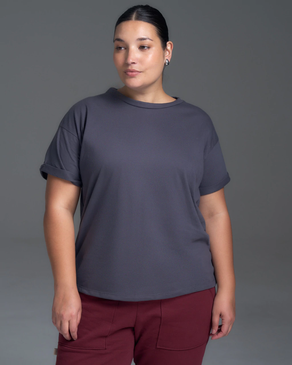 Realizada en jersey de gramaje intermedio, tiene escote redondo y mangas con terminación doblada.