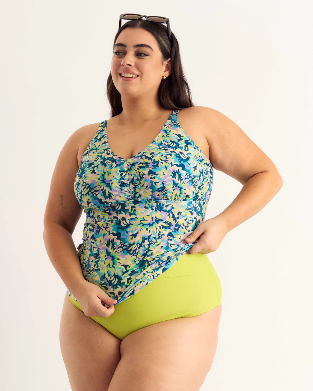 Remera musculosa de bretel ancho con elástico interno y regulador de zamac (no oxida, no se recalienta). La amamos por su escote en V elegante y muy cómodo, y sus tasas con amplia capacidad. El recorte bajo busto tiene elástico incorporado para mejor sostén. Largo a la cadera.