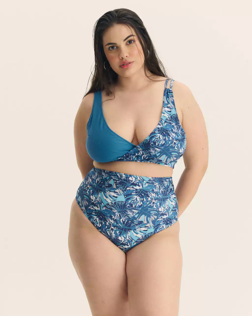 La delantera es amplia, con tasas con gran capacidad, pensadas especialmente para bustos grandes. Posee un cruce delantero que genera un efecto visual muy lindo, combinando estampado con color pleno.