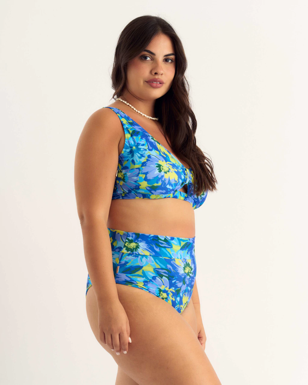 Top con escote profundo y espalda cavada. Mucha capacidad de contención gracias a sus amplias tasas. Posee pinzas laterales y elástico bajo busto en la delantera. Por atrás, se ata mediante un ganchito mariposa de zamak (no se oxida ni recalienta).